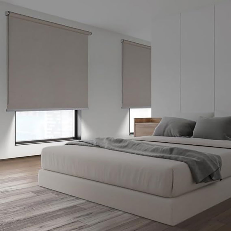 Estor enrollable opaco que impide el paso de la luz. Opacidad total en el mínimo espacio. Puede ocultarse tras otra cortina o instalarse a la vista con su estética de estor moderno. Puede sustituir la persiana exterior.
