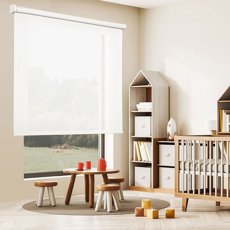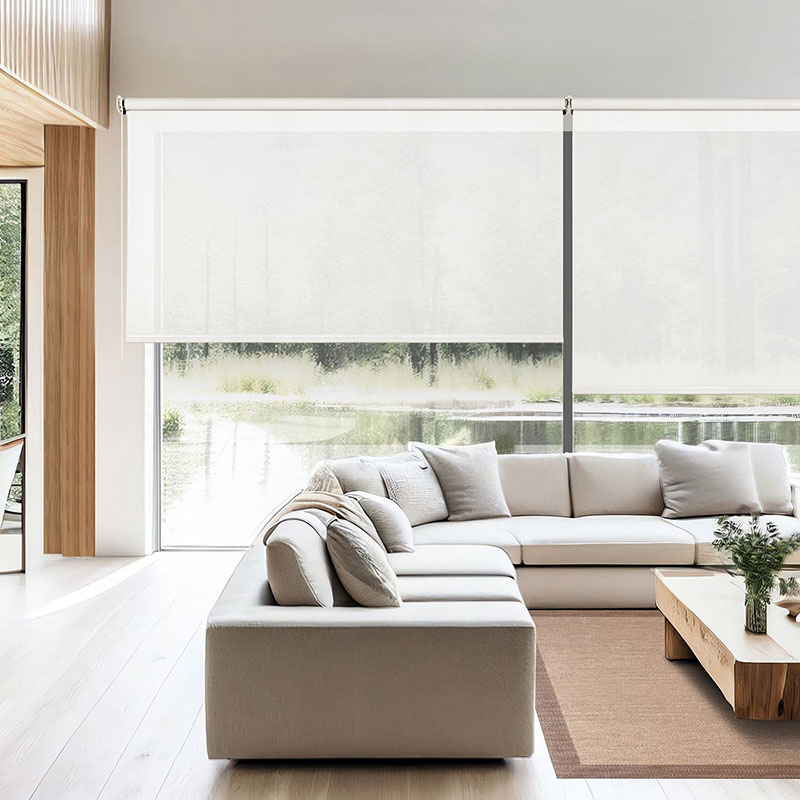 Estor enrollable cuyo tejido técnico, además de una atractiva estética moderna, proporciona numerosas cualidades que lo convierten en una solución versátil para cualquier estancia.