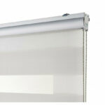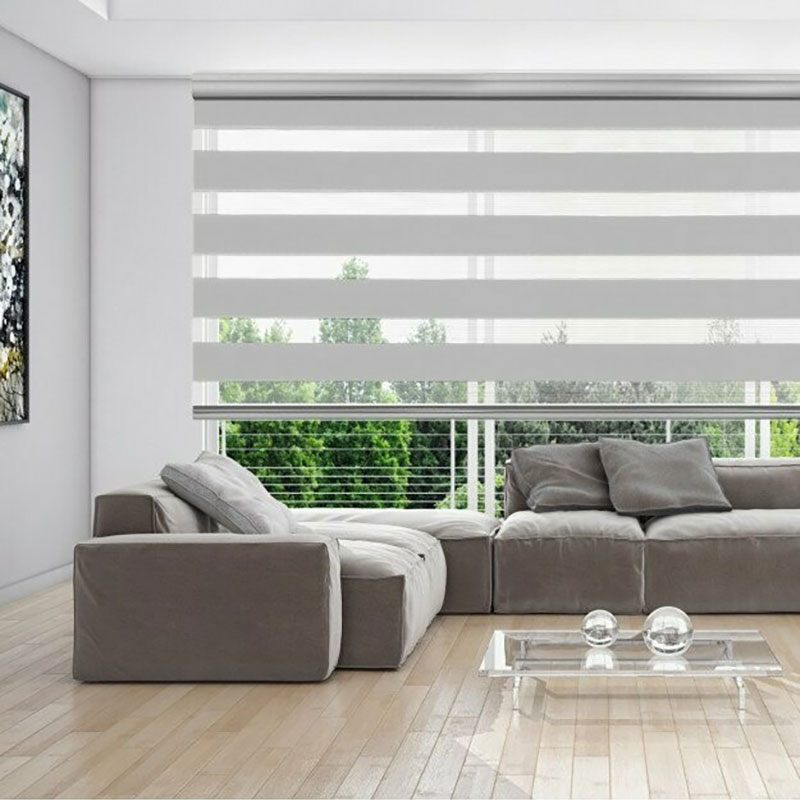 Estor enrrollable doble en tejido de franjas transparentes cuyo movimiento vertical proporciona un decorativo y práctico juego de luz, así como el control de la visión exterior y la privacidad.